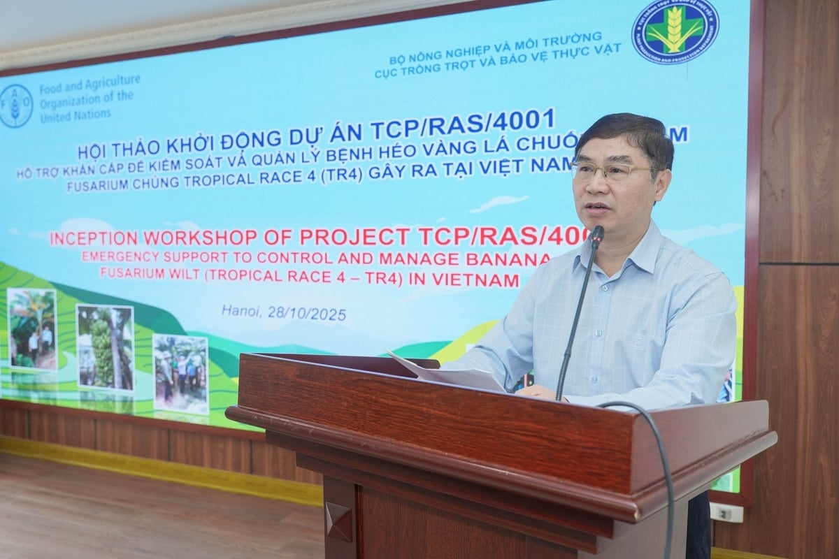 Phó Cục trưởng Cục Trồng trọt và Bảo vệ thực vật Nguyễn Quý Dương phát biểu tại hội thảo. Ảnh: Bảo Thắng.Ông Nguyễn Quý Dương, Phó Cục trưởng Cục Trồng trọt và Bảo vệ thực vật, đơn vị chủ trì dự án chia sẻ, Việt Nam hiện có hơn 157.000 ha trồng chuối, sản lượng đạt khoảng 2,3 triệu tấn/năm. Khảo sát của Cục cho thấy chủng TR4 đã xuất hiện ở 6/12 địa phương được lấy mẫu, gồm Tây Ninh, Long An, Lào Cai, Lai Châu, Hà Nội và Hưng Yên.